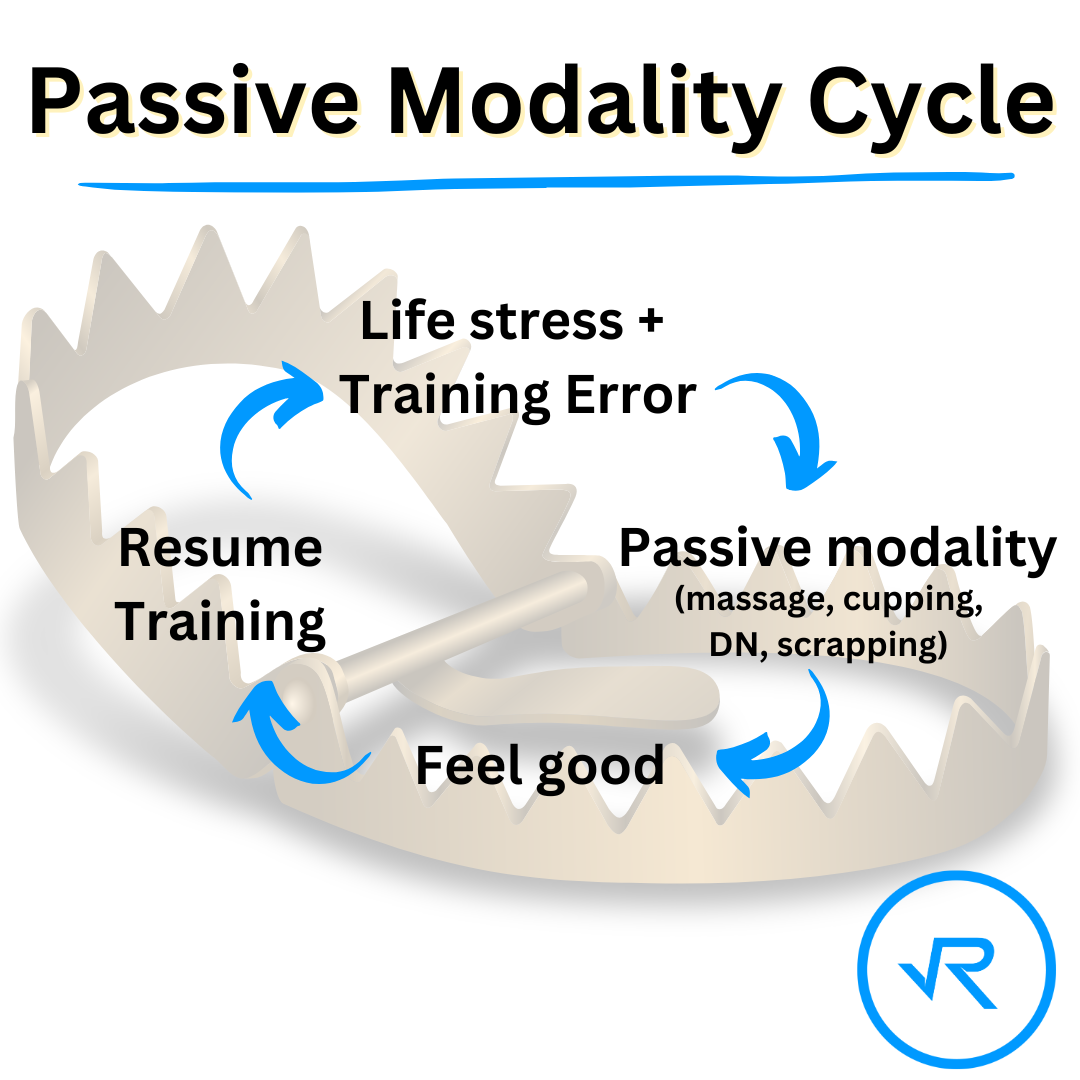 Far too many people are! Our society that prioritizes and loves quick fixes. But the effects of these passive modalities (dry needling, massage, cupping, scrapping, adjustments or any other similar modality) don’t always get to the root of the issue. Do they temporarily modify your symptoms of pain and tightness? Yes! However, often runners develop a perceived need for these supports due to training errors and not respecting how much other life factors are playing a role in their tolerance of running. Thus, they become trapped the passive modality cycle. It’s easy to fall into. (Gregory 2022, Sefferin 2019, Troffa 2020, Savva 2021, Neilson 2014, Otter 2016)